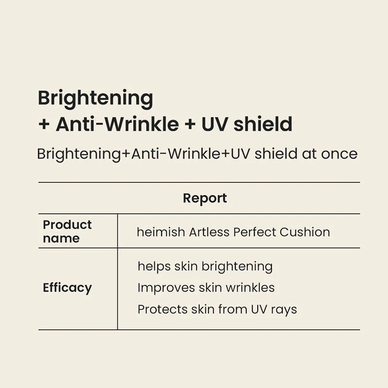 The Heimish Artless Perfect Cushion (SPF50+ PA+++) is the perfect blend of skincare and weightless foundation coverage in one. Never messy or cakey, the Heimish Artless Perfect Cushion compact is loaded with botanicals that hydrate, protect and brighten the skin for a naturally flawless finish that lasts all day. This cushion has a fresh and glowy finish that is not too dewy or matte. Housed in a Mochi cushion, a unique Korean cushion technology that pumps the content only when itβs pressed, keeping the product fresher longer. This compact also comes with a refill.