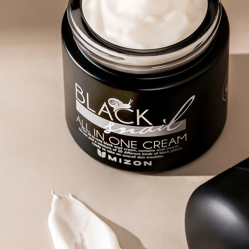 The Mizon Black Snail All In One Cream contains 90% of black snail secretion filtrate from Africa and 20 kinds of black plant extract that help heal skin troubles, tighten pores, and improve skin tone. Adenosine certified for wrinkle care, peptide, and 5 type of vitamins firm skin effectively. The niacin amide certified for lightening skin improves dull skin tone. The mucin from black snail secretion filtrate helps heal blemishes and damaged skin. Also, shea butter provides skin with rich moisture. Olive oil forms a moisture-retaining film to keep skin soft all day long. Barberry root, cacao tree, other plants extract soothe and protect irritated skin. The formula is safe for sensitive skin and free of artificial coloring, fragrance, and paraben to minimize skin irritation.