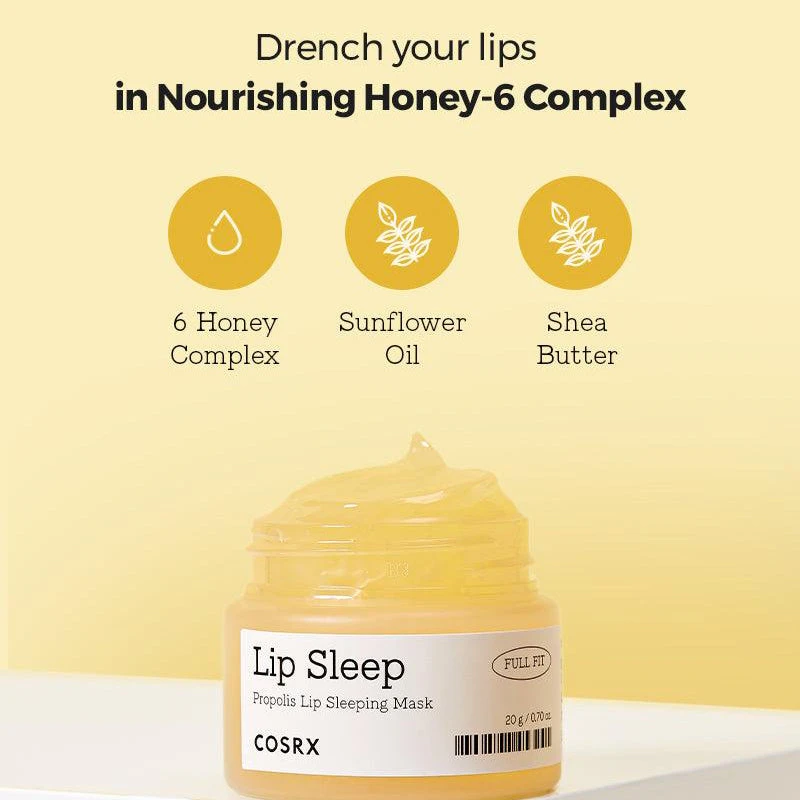 The COSRX Full Fit Propolis Lip Sleeping Mask is a multi-lip mask that can be used as an overnight treatment or as a lip balm during the day. Formulated with 6 different kinds of honey extract, the overnight lip mask will replenish and soothe any chapped lips by keeping them fresh and dewy. The rich formula of the Full Fit Propolis Lip Sleeping Mask has a rich texture but will quickly absorb into your lips which results in refreshed, hydrated lips.