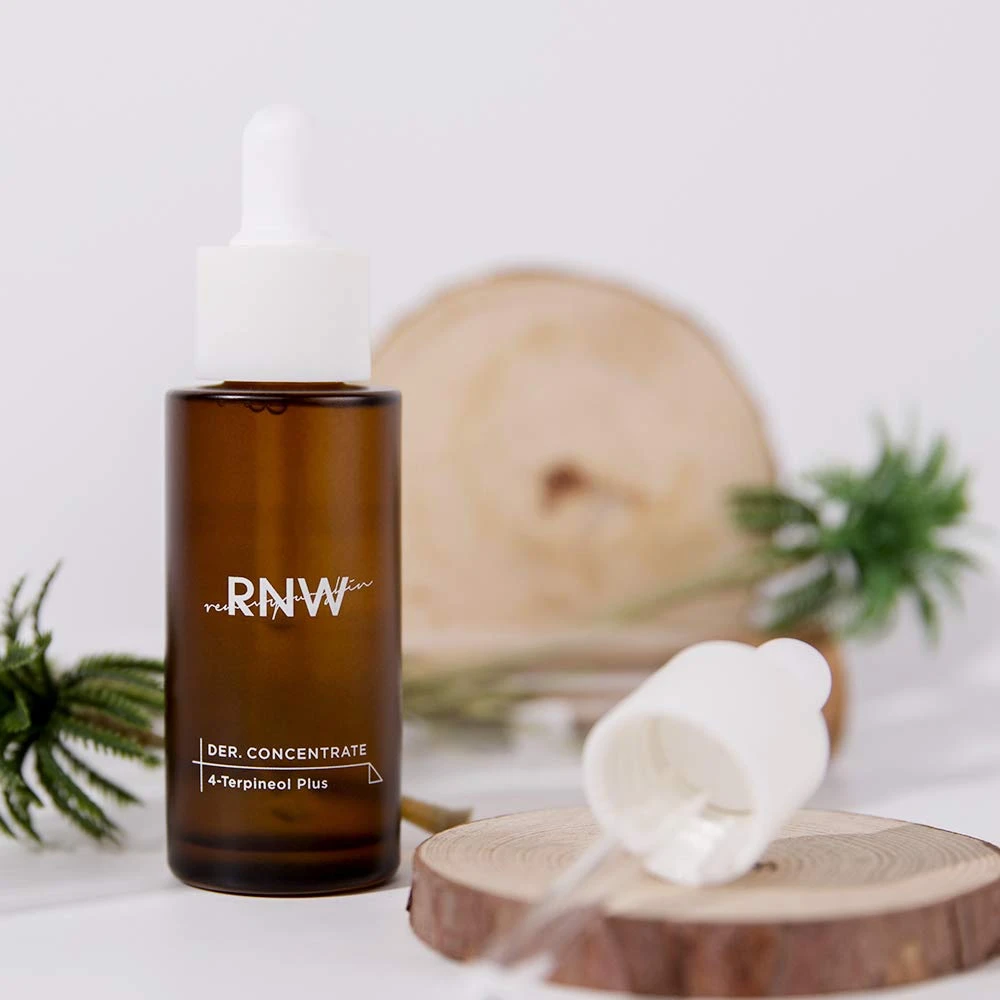 The RNW DER. Concentrate 4-Terpineol Plus is a light and smooth serum thatΒ harnesses the anti-inflammatory benefits of 4-Terpineol (the main ingredient found in tea tree oil) to calm and correct troubled skin. Suitable for both young and mature skin, the 4-Terpineol Plus Serum fights stubborn breakouts using Lactoferrin, a breakthrough ingredient that neutralizes the presence of P-acne bacteria on the skin. Centella Asiatica and Fig Extract play supporting roles to provide antioxidant protection and supply the skin with intense hydration. This serum is expertly formulated without the use of parabens, fragrances, or irritating additives.Β