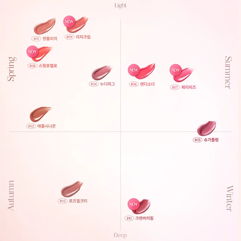 #01 Gentle Peach:Β Hydrogenated Polyisobutene, Dipentaerythrityl Tetrahydroxystearate/Tetraisostearate, Ethylhexyl Hydroxystearate, Tridecyl Trimellitate, Methyl Hydrogenated Rosinate, Phytosteryl/Isostearyl/Cetyl/Stearyl/Behenyl Dimer Dilinoleate, Propylene Glycol Dibenzoate, Synthetic Wax, Diisostearyl Malate, Paraffin, Argania Spinosa Kernel Oil, Simmondsia Chinensis Seed Oil, Acer Saccharum Extract, Euterpe Oleracea Fruit Extract, Fragaria Chiloensis Fruit Extract, Lycium Chinense Fruit Extract, Morus Nigra Fruit Extract, Ribes Nigrum Fruit Extract, Rubus Fruticosus Fruit Extract, Rubus Idaeus Fruit Extract, Vaccinium Angustifolium Fruit Extract, Vaccinium Macrocarpon Fruit Extract, Vaccinium Myrtillus Fruit Extract, Phytosteryl Macadamiate, Silica Silylate, Sorbitan Isostearate, VP/Hexadecene Copolymer, Dextrin Palmitate, Microcrystalline Wax, Polyglyceryl-2 Triisostearate, Microcrystalline Cellulose, Polyglyceryl-2 Diisostearate, Water, Butylene Glycol, Ethylhexylglycerin, Phenoxyethanol, Titanium Dioxide, Iron Oxides, Iron Oxides, Red 7 Lake, Yellow 6 Lake, Iron Oxides