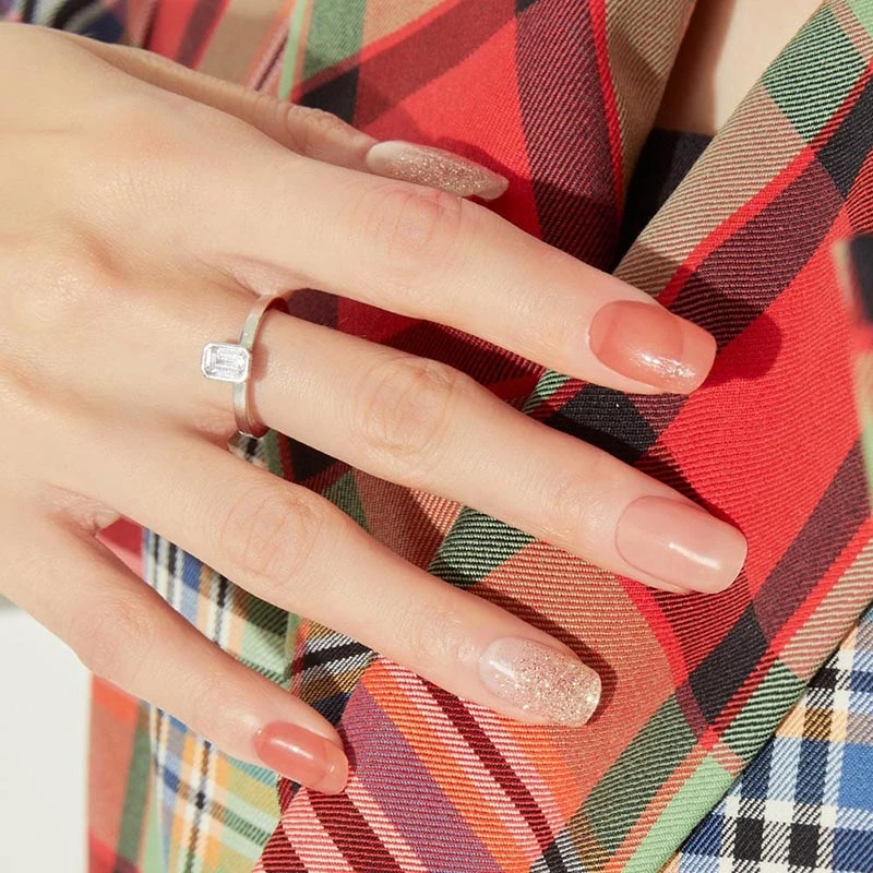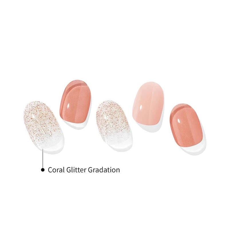 Elevate your look with a stunning multi-colored nude manicure! Combining coral and peach gel with a radiant rose-gold glitter ombrΓ©.