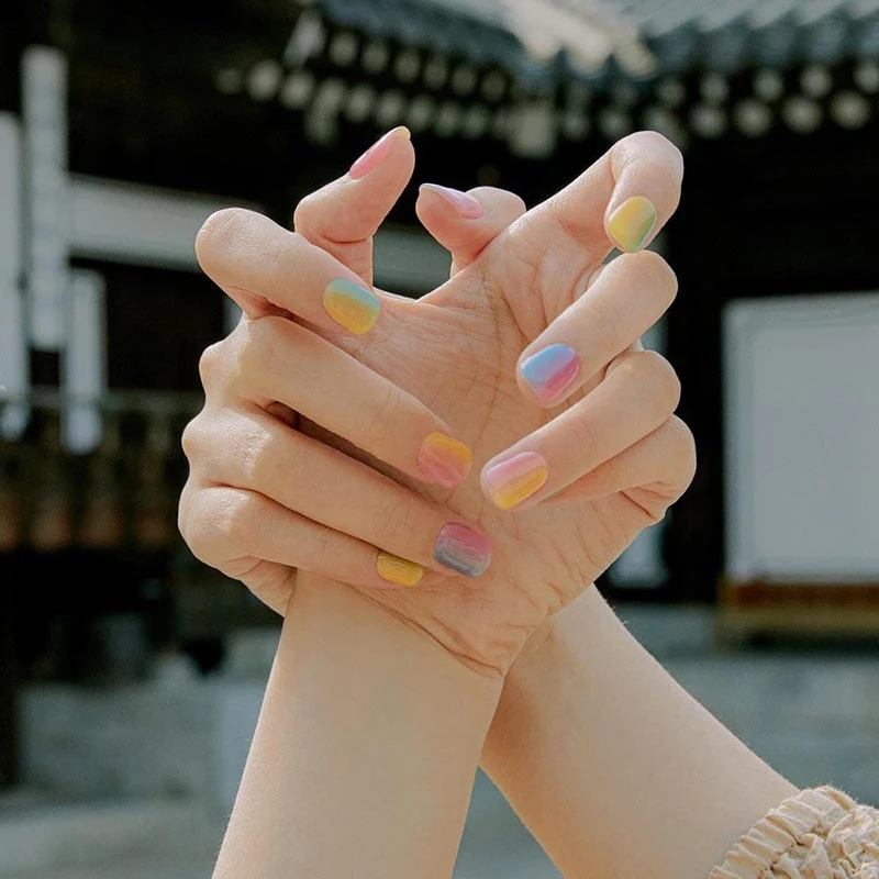 Subtle yet vibrant! This rainbow-colored gel manicure blends pastel hues seamlessly into a vertical ombrΓ©, perfect for everyday wear.