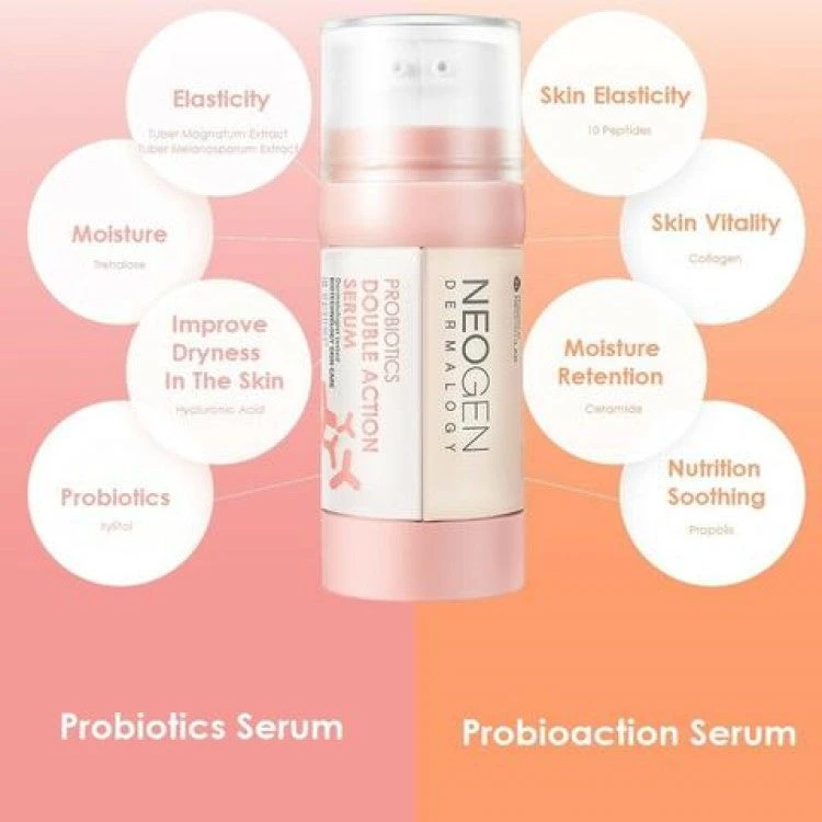 The Neogen Probiotics Double Action Serum is a double-sided packaging antiaging serum that comes in two equally powerful formulations giving your skin intensive nourishment. The probiotics serum revitalizes the skin from stress with effective ingredients, while the pro barrier action serum strengthens and protects the skin with added ceramides and peptides. Mix and evenly apply the two serums to a cleansed and toned face by day and night for optimal results.